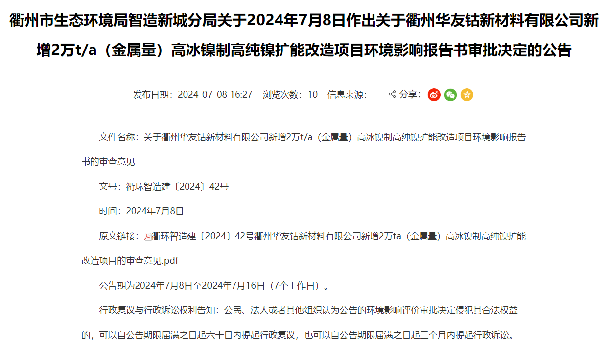 華友鈷新材料新增2萬t/a高冰鎳制高純鎳擴(kuò)能改造項(xiàng)目環(huán)評獲審批